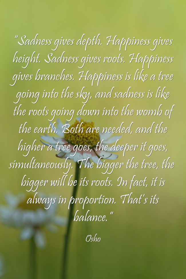 "“Sadness gives depth. Happiness gives height. Sadness gives roots. Happiness gives branches. Happiness is like a tree going into the sky, and sadness is like the roots going down into the womb of the earth. Both are needed, and the higher a tree goes, the deeper it goes, simultaneously. The bigger the tree, the bigger will be its roots. In fact, it is always in proportion. That’s its balance.”"