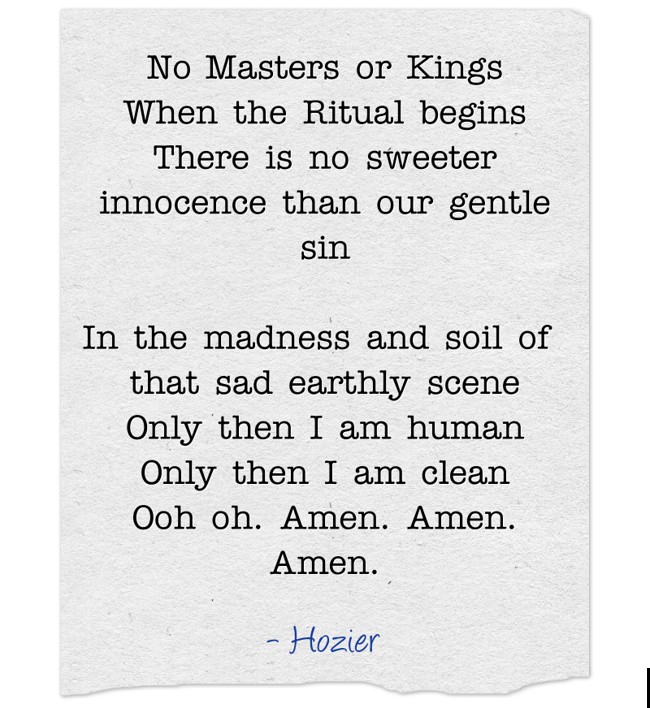 "No Masters or Kings When the Ritual begins There is no sweeter innocence than our gentle sin In the madness and soil of that sad earthly scene Only then I am human Only then I am clean Ooh oh. Amen. Amen. Amen."