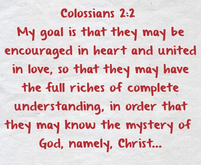 "Colossians 2:2 My goal is that they may be encouraged in heart and united in love, so that they may have the full riches of complete understanding, in order that they may know the mystery of God, namely, Christ..."