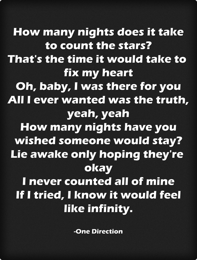 "How many nights does it take to count the stars? That's the time it would take to fix my heart Oh, baby, I was there for you All I ever wanted was the truth, yeah, yeah How many nights have you wished someone would stay? Lie awake only hoping they're okay I never counted all of mine If I tried, I know it would feel like infinity."