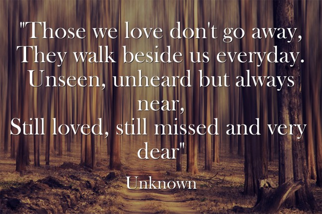 ""Those we love don't go away, They walk beside us everyday. Unseen, unheard but always near, Still loved, still missed and very dear""