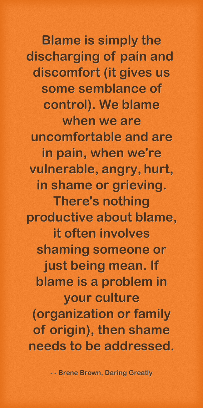"Blame is simply the discharging of pain and discomfort (it gives us some semblance of control). We blame when we are uncomfortable and are in pain, when we're vulnerable, angry, hurt, in shame or grieving. There's nothing productive about blame, it often involves shaming someone or just being mean. If blame is a problem in your culture (organization or family of origin), then shame needs to be addressed. "
