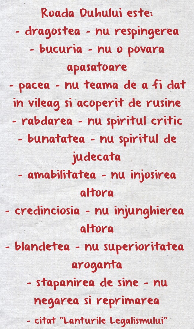 "Roada Duhului este: - dragostea - nu respingerea - bucuria - nu o povara apasatoare - pacea - nu teama de a fi dat in vileag si acoperit de rusine - rabdarea - nu spiritul critic - bunatatea - nu spiritul de judecata - amabilitatea - nu injosirea altora - credinciosia - nu injunghierea altora - blandetea - nu superioritatea aroganta - stapanirea de sine - nu negarea si reprimarea"