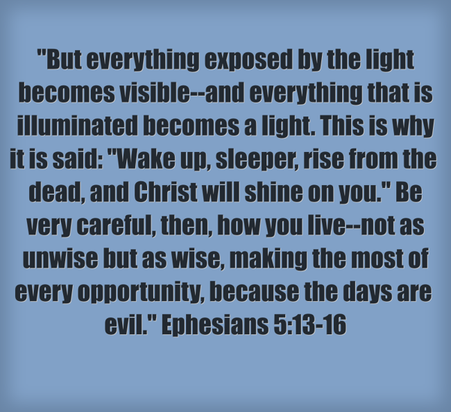 ""But everything exposed by the light becomes visible--and everything that is illuminated becomes a light. This is why it is said: "Wake up, sleeper, rise from the dead, and Christ will shine on you." Be very careful, then, how you live--not as unwise but as wise, making the most of every opportunity, because the days are evil." Ephesians 5:13-16"