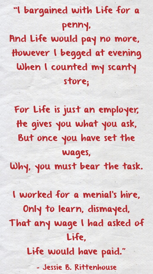 "“I bargained with Life for a penny, And Life would pay no more, However I begged at evening When I counted my scanty store; For Life is just an employer, He gives you what you ask, But once you have set the wages, Why, you must bear the task. I worked for a menial's hire, Only to learn, dismayed, That any wage I had asked of Life, Life would have paid.”"