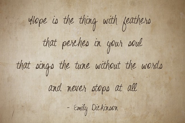 "Hope is the thing with feathers that perches in your soul that sings the tune without the words and never stops at all"