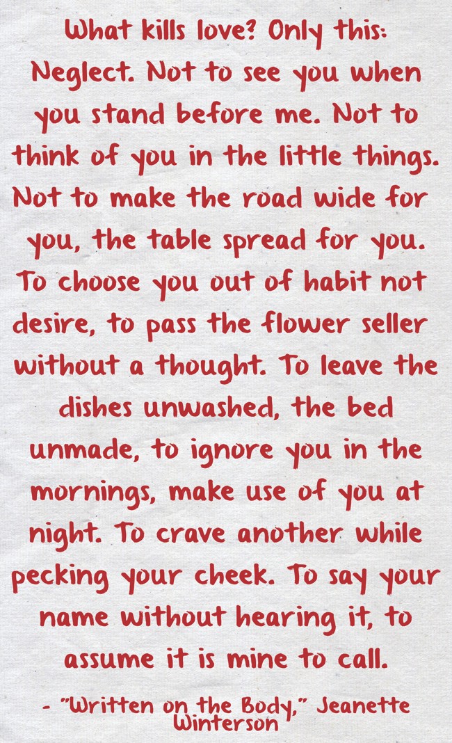 "What kills love? Only this: Neglect. Not to see you when you stand before me. Not to think of you in the little things. Not to make the road wide for you, the table spread for you. To choose you out of habit not desire, to pass the flower seller without a thought. To leave the dishes unwashed, the bed unmade, to ignore you in the mornings, make use of you at night. To crave another while pecking your cheek. To say your name without hearing it, to assume it is mine to call."
