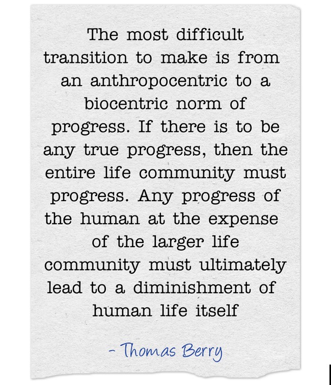 "The most difficult transition to make is from an anthropocentric to a biocentric norm of progress. If there is to be any true progress, then the entire life community must progress. Any progress of the human at the expense of the larger life community must ultimately lead to a diminishment of human life itself"