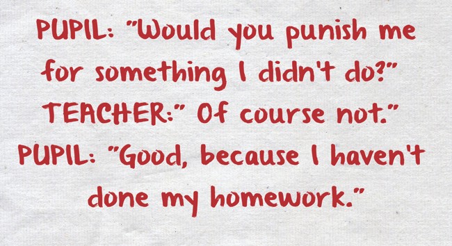 "PUPIL: "Would you punish me for something I didn't do?" TEACHER:" Of course not." PUPIL: "Good, because I haven't done my homework.""