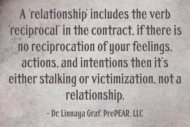 "A 'relationship' includes the verb 'reciprocal' in the contract, if there is no reciprocation of your feelings, actions, and intentions then it’s either stalking or victimization, not a relationship."
