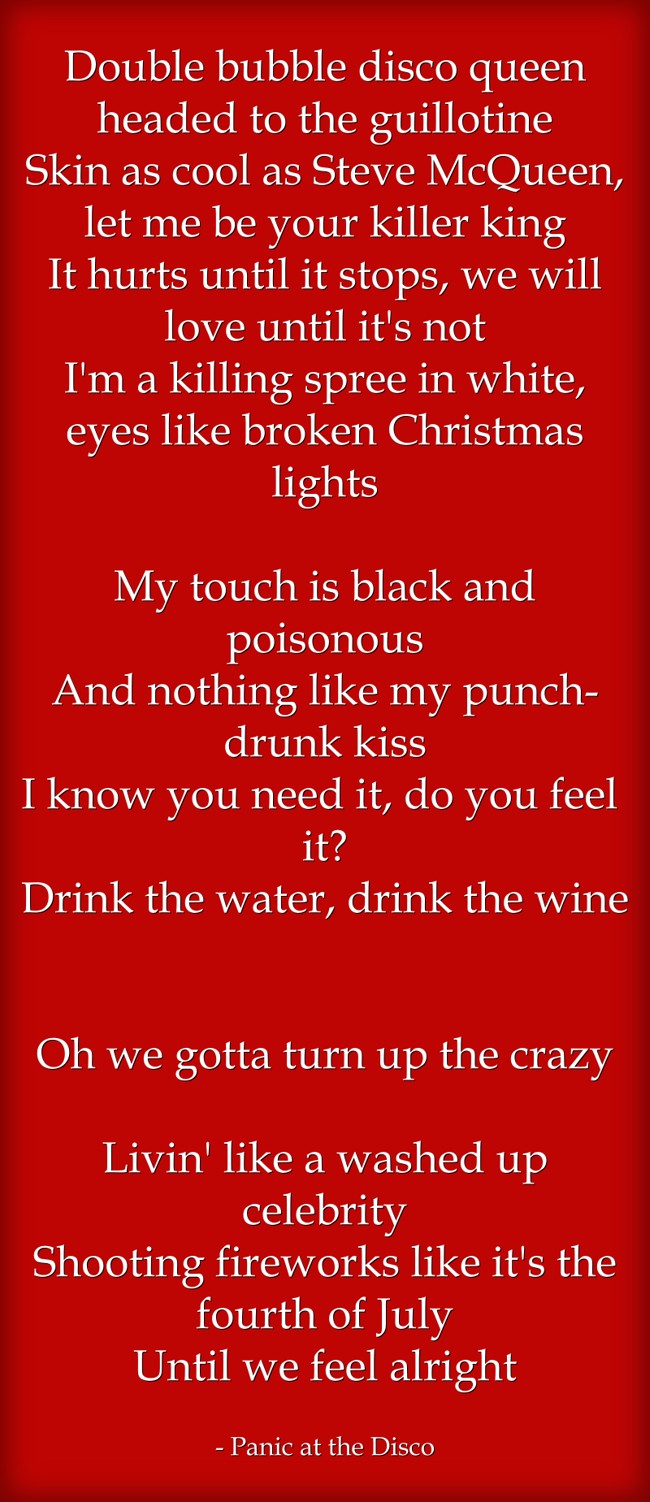 "Double bubble disco queen headed to the guillotine Skin as cool as Steve McQueen, let me be your killer king It hurts until it stops, we will love until it's not I'm a killing spree in white, eyes like broken Christmas lights My touch is black and poisonous And nothing like my punch-drunk kiss I know you need it, do you feel it? Drink the water, drink the wine Oh we gotta turn up the crazy Livin' like a washed up celebrity Shooting fireworks like it's the fourth of July Until we feel alright"