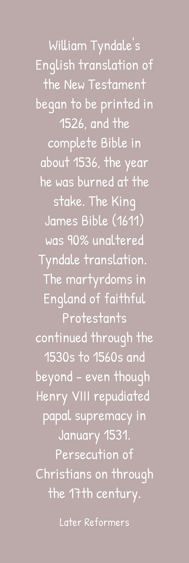 "William Tyndale's English translation of the New Testament began to be printed in 1526, and the complete Bible in about 1536, the year he was burned at the stake. The King James Bible (1611) was 90% unaltered Tyndale translation. The martyrdoms in England of faithful Protestants continued through the 1530s to 1560s and beyond - even though Henry VIII repudiated papal supremacy in January 1531. Persecution of Christians on through the 17th century."