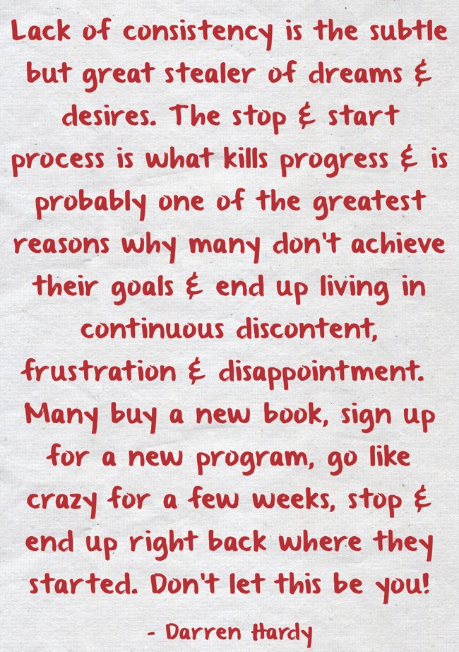"Lack of consistency is the subtle but great stealer of dreams & desires. The stop & start process is what kills progress & is probably one of the greatest reasons why many don’t achieve their goals & end up living in continuous discontent, frustration & disappointment. Many buy a new book, sign up for a new program, go like crazy for a few weeks, stop & end up right back where they started. Don't let this be you!"