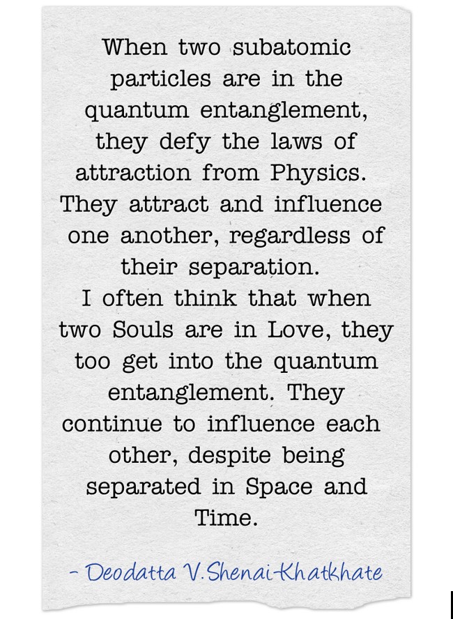 "When two subatomic particles are in the quantum entanglement, they defy the laws of attraction from Physics. They attract and influence one another, regardless of their separation. I often think that when two Souls are in Love, they too get into the quantum entanglement. They continue to influence each other, despite being separated in Space and Time."