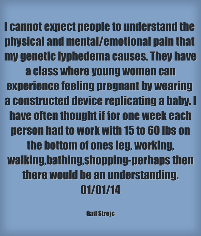 "I cannot expect people to understand the physical and mental/emotional pain that my genetic lyphedema causes. They have a class where young women can experience feeling pregnant by wearing a constructed device replicating a baby. I have often thought if for one week each person had to work with 15 to 60 lbs on the bottom of ones leg, working, walking,bathing,shopping-perhaps then there would be an understanding. 01/01/14"