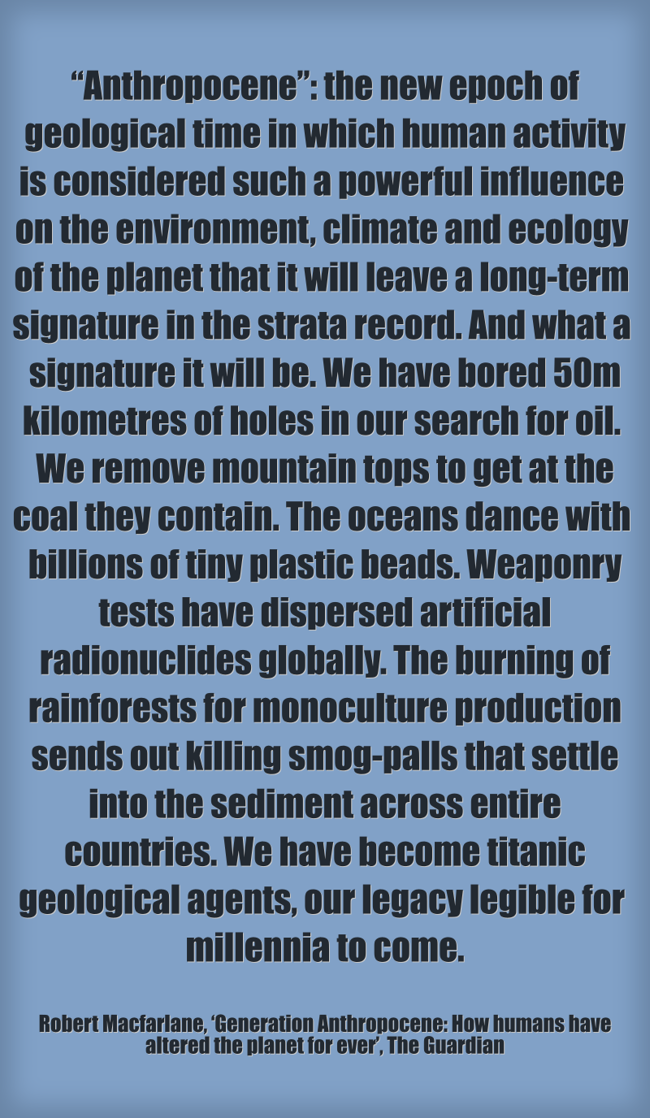 "“Anthropocene”: the new epoch of geological time in which human activity is considered such a powerful influence on the environment, climate and ecology of the planet that it will leave a long-term signature in the strata record. And what a signature it will be. We have bored 50m kilometres of holes in our search for oil. We remove mountain tops to get at the coal they contain. The oceans dance with billions of tiny plastic beads. Weaponry tests have dispersed artificial radionuclides globally. The burning of rainforests for monoculture production sends out killing smog-palls that settle into the sediment across entire countries. We have become titanic geological agents, our legacy legible for millennia to come. "