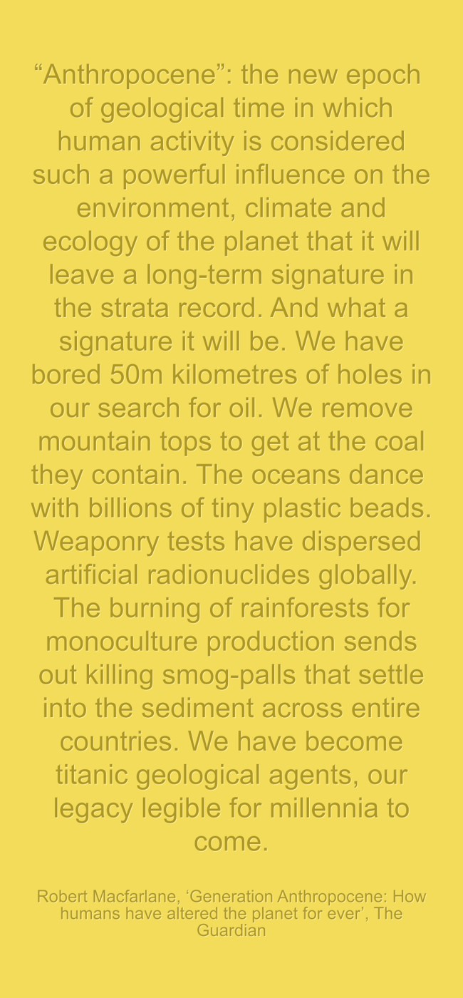 "“Anthropocene”: the new epoch of geological time in which human activity is considered such a powerful influence on the environment, climate and ecology of the planet that it will leave a long-term signature in the strata record. And what a signature it will be. We have bored 50m kilometres of holes in our search for oil. We remove mountain tops to get at the coal they contain. The oceans dance with billions of tiny plastic beads. Weaponry tests have dispersed artificial radionuclides globally. The burning of rainforests for monoculture production sends out killing smog-palls that settle into the sediment across entire countries. We have become titanic geological agents, our legacy legible for millennia to come. "