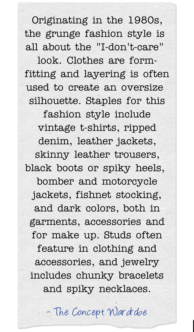 "Originating in the 1980s, the grunge fashion style is all about the "I-don't-care" look. Clothes are form-fitting and layering is often used to create an oversize silhouette. Staples for this fashion style include vintage t-shirts, ripped denim, leather jackets, skinny leather trousers, black boots or spiky heels, bomber and motorcycle jackets, fishnet stocking, and dark colors, both in garments, accessories and for make up. Studs often feature in clothing and accessories, and jewelry includes chunky bracelets and spiky necklaces."