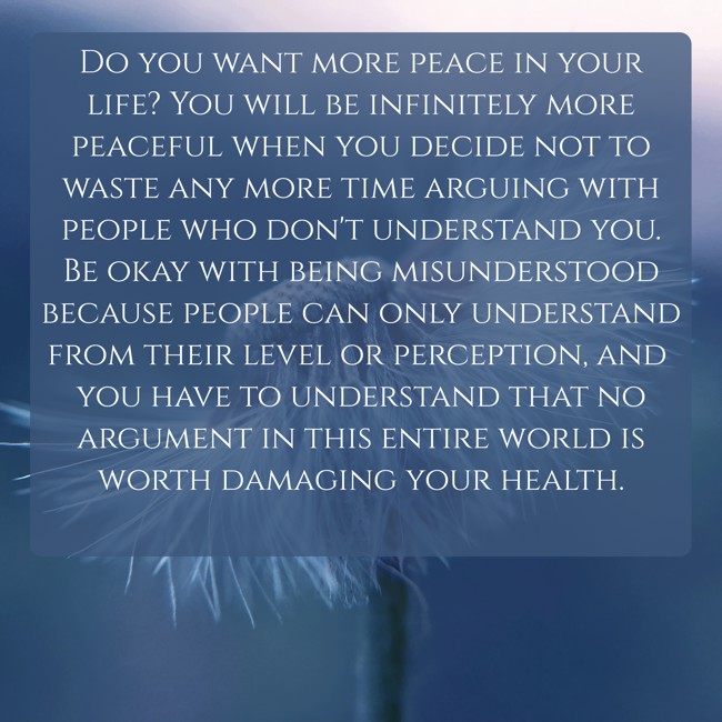 "Do you want more peace in your life? You will be infinitely more peaceful when you decide not to waste any more time arguing with people who don't understand you. Be okay with being misunderstood because people can only understand from their level or perception, and you have to understand that no argument in this entire world is worth damaging your health."