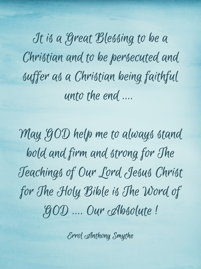 "It is a Great Blessing to be a Christian and to be persecuted and suffer as a Christian being faithful unto the end .... May GOD help me to always stand bold and firm and strong for The Teachings of Our Lord Jesus Christ for The Holy Bible is The Word of GOD .... Our Absolute !"