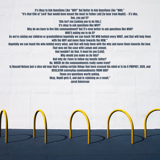 "It’s Okay to Ask Questions Like “WHY” But Better to Ask Questions Like “WHO.” “It's that title of ‘Lord’ that would have meant the most to Father Lehi [to hear from Nephi] -- it’s like, Son, you get it? This isn't me [asking you to do this.] It's okay to ask questions like WHY? Why do we have to live this commandment? But it's even better to ask questions like WHO? WHO'S asking me to do it? As we're raising our children or grandchildren hopefully we can teach THE WHO behind every WHAT, and that will help them with the WHY and move them towards the HOW.” Hopefully we can teach the who behind every what, and that will help them with the why and move them towards the how. That was not the case with Laman and Lemuel. God wouldn't do that. It must be you [Lehi]. Why would you make us do this? And why do I have to follow my lunatic father? No, WHERE do the commandments really come from? Is Russell Nelson just a nice old man that's asking certain things that have crossed his mind or is he A PROPHET, SEER, and REVELATOR conveying commandments FROM GOD? Those are questions worth asking. Okay, Nephi gets it, and dad is rejoicing as a result.” Jared Halverson"
