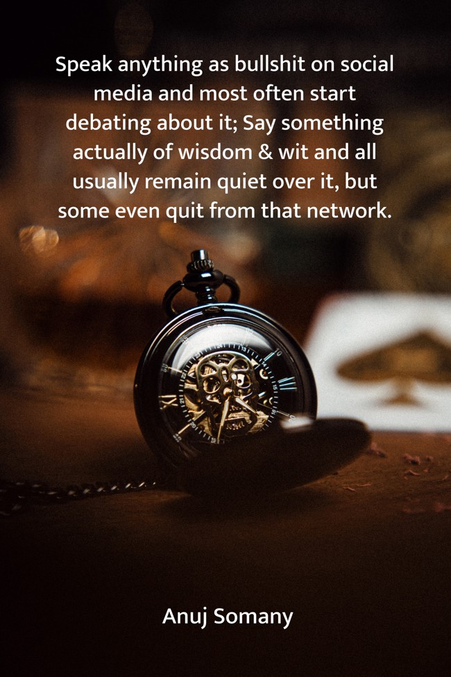 "Speak anything as bullshit on social media and most often start debating about it; Say something actually of wisdom & wit and all usually remain quiet over it, but some even quit from that network."