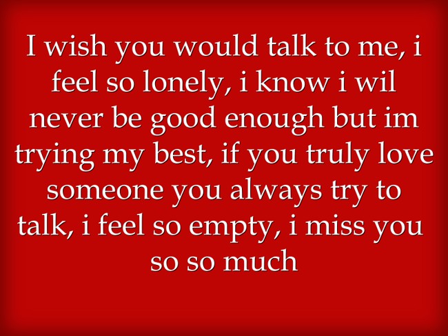 "I wish you would talk to me, i feel so lonely, i know i wil never be good enough but im trying my best, if you truly love someone you always try to talk, i feel so empty, i miss you so so much"