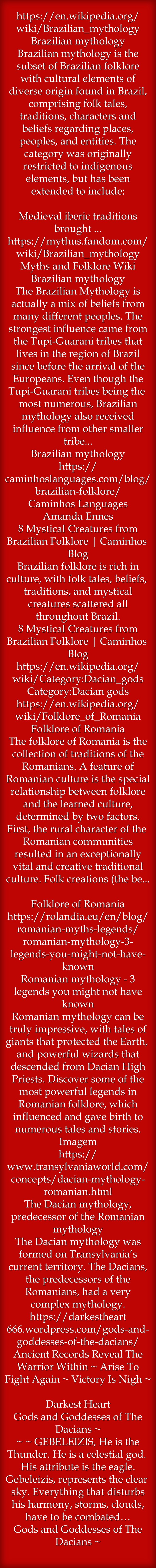 "https://en.wikipedia.org/wiki/Brazilian_mythology Brazilian mythology Brazilian mythology is the subset of Brazilian folklore with cultural elements of diverse origin found in Brazil, comprising folk tales, traditions, characters and beliefs regarding places, peoples, and entities. The category was originally restricted to indigenous elements, but has been extended to include: Medieval iberic traditions brought ... https://mythus.fandom.com/wiki/Brazilian_mythology Myths and Folklore Wiki Brazilian mythology The Brazilian Mythology is actually a mix of beliefs from many different peoples. The strongest influence came from the Tupi-Guarani tribes that lives in the region of Brazil since before the arrival of the Europeans. Even though the Tupi-Guarani tribes being the most numerous, Brazilian mythology also received influence from other smaller tribe... Brazilian mythology https://caminhoslanguages.com/blog/brazilian-folklore/ Caminhos Languages Amanda Ennes 8 Mystical Creatures from Brazilian Folklore | Caminhos Blog Brazilian folklore is rich in culture, with folk tales, beliefs, traditions, and mystical creatures scattered all throughout Brazil. 8 Mystical Creatures from Brazilian Folklore | Caminhos Blog https://en.wikipedia.org/wiki/Category:Dacian_gods Category:Dacian gods https://en.wikipedia.org/wiki/Folklore_of_Romania Folklore of Romania The folklore of Romania is the collection of traditions of the Romanians. A feature of Romanian culture is the special relationship between folklore and the learned culture, determined by two factors. First, the rural character of the Romanian communities resulted in an exceptionally vital and creative traditional culture. Folk creations (the be... Folklore of Romania https://rolandia.eu/en/blog/romanian-myths-legends/romanian-mythology-3-legends-you-might-not-have-known Romanian mythology - 3 legends you might not have known Romanian mythology can be truly impressive, with tales of giants that protected the Earth, and powerful wizards that descended from Dacian High Priests. Discover some of the most powerful legends in Romanian folklore, which influenced and gave birth to numerous tales and stories. Imagem https://www.transylvaniaworld.com/concepts/dacian-mythology-romanian.html The Dacian mythology, predecessor of the Romanian mythology The Dacian mythology was formed on Transylvania’s current territory. The Dacians, the predecessors of the Romanians, had a very complex mythology. https://darkestheart666.wordpress.com/gods-and-goddesses-of-the-dacians/ Ancient Records Reveal The Warrior Within ~ Arise To Fight Again ~ Victory Is Nigh ~ Darkest Heart Gods and Goddesses of The Dacians ~ ~ ~ GEBELEIZIS, He is the Thunder. He is a celestial god. His attribute is the eagle. Gebeleizis, represents the clear sky. Everything that disturbs his harmony, storms, clouds, have to be combated… Gods and Goddesses of The Dacians ~"