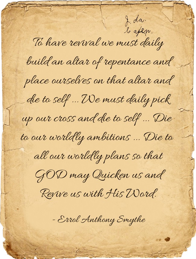 "To have revival we must daily build an altar of repentance and place ourselves on that altar and die to self ... We must daily pick up our cross and die to self ... Die to our worldly ambitions ... Die to all our worldly plans so that GOD may Quicken us and Revive us with His Word."