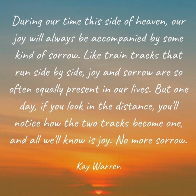 "During our time this side of heaven, our joy will always be accompanied by some kind of sorrow. Like train tracks that run side by side, joy and sorrow are so often equally present in our lives. But one day, if you look in the distance, you'll notice how the two tracks become one, and all we'll know is joy. No more sorrow."