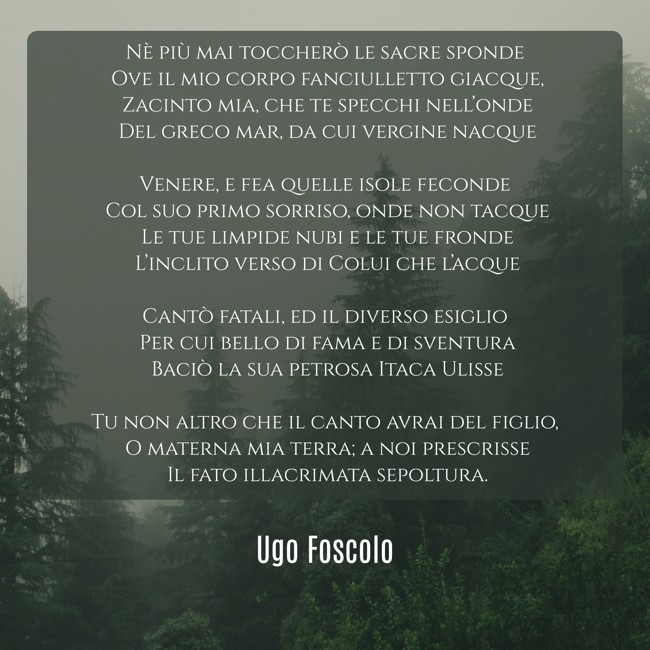 "Nè più mai toccherò le sacre sponde Ove il mio corpo fanciulletto giacque, Zacinto mia, che te specchi nell’onde Del greco mar, da cui vergine nacque Venere, e fea quelle isole feconde Col suo primo sorriso, onde non tacque Le tue limpide nubi e le tue fronde L’inclito verso di Colui che l’acque Cantò fatali, ed il diverso esiglio Per cui bello di fama e di sventura Baciò la sua petrosa Itaca Ulisse Tu non altro che il canto avrai del figlio, O materna mia terra; a noi prescrisse Il fato illacrimata sepoltura."
