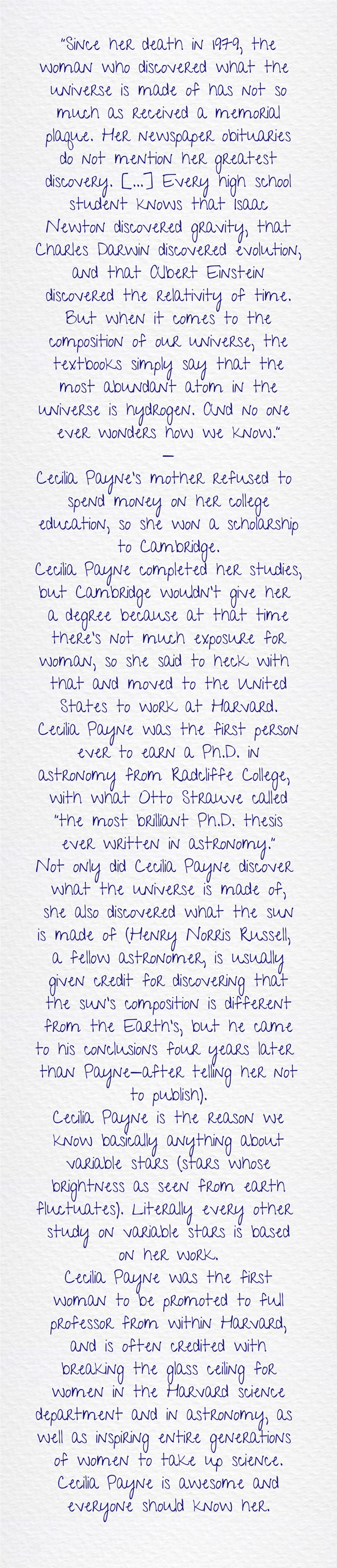 "“Since her death in 1979, the woman who discovered what the universe is made of has not so much as received a memorial plaque. Her newspaper obituaries do not mention her greatest discovery. […] Every high school student knows that Isaac Newton discovered gravity, that Charles Darwin discovered evolution, and that Albert Einstein discovered the relativity of time. But when it comes to the composition of our universe, the textbooks simply say that the most abundant atom in the universe is hydrogen. And no one ever wonders how we know.” — Cecilia Payne’s mother refused to spend money on her college education, so she won a scholarship to Cambridge. Cecilia Payne completed her studies, but Cambridge wouldn’t give her a degree because at that time there's not much exposure for woman, so she said to heck with that and moved to the United States to work at Harvard. Cecilia Payne was the first person ever to earn a Ph.D. in astronomy from Radcliffe College, with what Otto Strauve called “the most brilliant Ph.D. thesis ever written in astronomy.” Not only did Cecilia Payne discover what the universe is made of, she also discovered what the sun is made of (Henry Norris Russell, a fellow astronomer, is usually given credit for discovering that the sun’s composition is different from the Earth’s, but he came to his conclusions four years later than Payne—after telling her not to publish). Cecilia Payne is the reason we know basically anything about variable stars (stars whose brightness as seen from earth fluctuates). Literally every other study on variable stars is based on her work. Cecilia Payne was the first woman to be promoted to full professor from within Harvard, and is often credited with breaking the glass ceiling for women in the Harvard science department and in astronomy, as well as inspiring entire generations of women to take up science. Cecilia Payne is awesome and everyone should know her."