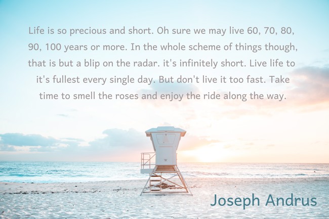 "Life is so precious and short. Oh sure we may live 60, 70, 80, 90, 100 years or more. In the whole scheme of things though, that is but a blip on the radar. it's infinitely short. Live life to it's fullest every single day. But don't live it too fast. Take time to smell the roses and enjoy the ride along the way."