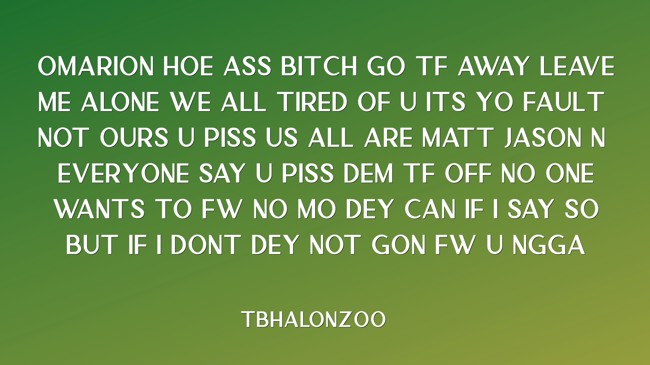 "OMARION HOE ASS BITCH GO TF AWAY LEAVE ME ALONE WE ALL TIRED OF U ITS YO FAULT NOT OURS U PISS US ALL ARE MATT JASON N EVERYONE SAY U PISS DEM TF OFF NO ONE WANTS TO FW NO MO DEY CAN IF I SAY SO BUT IF I DONT DEY NOT GON FW U NGGA"