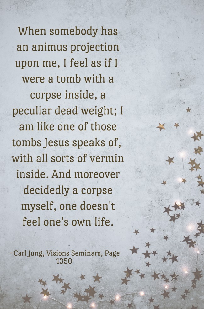 "When somebody has an animus projection upon me, I feel as if I were a tomb with a corpse inside, a peculiar dead weight; I am like one of those tombs Jesus speaks of, with all sorts of vermin inside. And moreover decidedly a corpse myself, one doesn't feel one's own life."