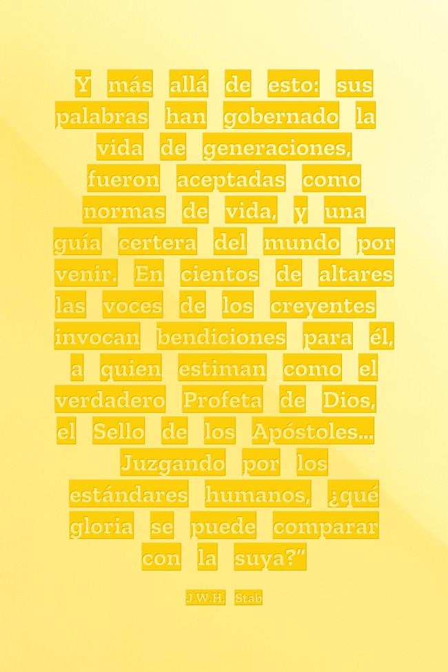 "Y más allá de esto: sus palabras han gobernado la vida de generaciones, fueron aceptadas como normas de vida, y una guía certera del mundo por venir. En cientos de altares las voces de los creyentes invocan bendiciones para él, a quien estiman como el verdadero Profeta de Dios, el Sello de los Apóstoles… Juzgando por los estándares humanos, ¿qué gloria se puede comparar con la suya?”"