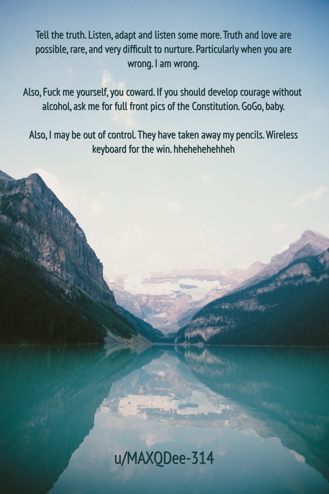 "Tell the truth. Listen, adapt and listen some more. Truth and love are possible, rare, and very difficult to nurture. Particularly when you are wrong. I am wrong. Also, Fuck me yourself, you coward. If you should develop courage without alcohol, ask me for full front pics of the Constitution. GoGo, baby. Also, I may be out of control. They have taken away my pencils. Wireless keyboard for the win. hhehehehehheh"