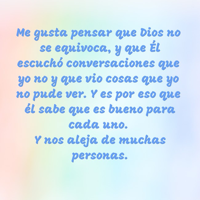 "Me gusta pensar que Dios no se equivoca, y que Él escuchó conversaciones que yo no y que vio cosas que yo no pude ver. Y es por eso que él sabe que es bueno para cada uno. Y nos aleja de muchas personas."