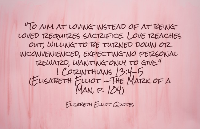 ""To aim at loving instead of at being loved requires sacrifice. Love reaches out, willing to be turned down or inconvenienced, expecting no personal reward, wanting only to give." I Corinthians 13:4-5 (Elisabeth Elliot ~The Mark of a Man, p. 104)"