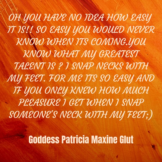 "OH YOU HAVE NO IDEA HOW EASY IT IS!! SO EASY YOU WOULD NEVER KNOW WHEN ITS COMING.YOU KNOW WHAT MY GREATEST TALENT IS ? I SNAP NECKS WITH MY FEET. FOR ME ITS SO EASY AND IF YOU ONLY KNEW HOW MUCH PLEASURE I GET WHEN I SNAP SOMEONE'S NECK WITH MY FEET;)"